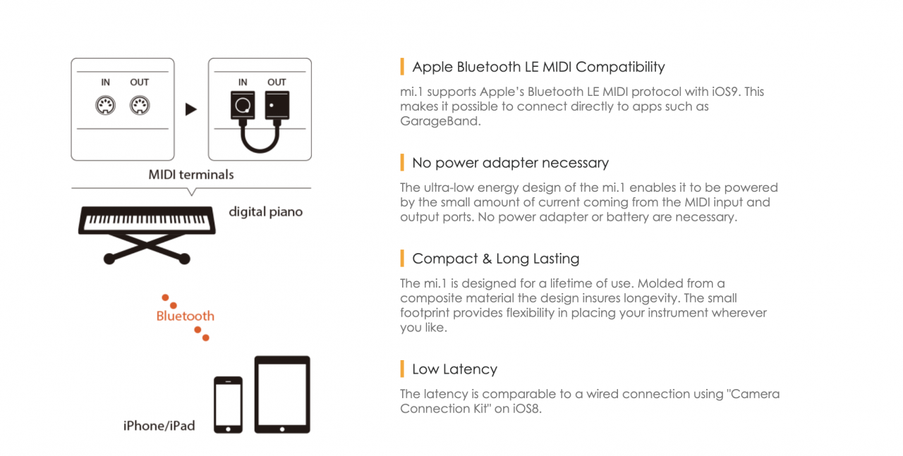 mi.1 wirelessly connects MIDI devices to iPhone and iPad. Simply connect the mi.1 to your digital piano’s MIDI ports.