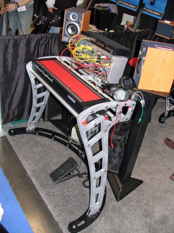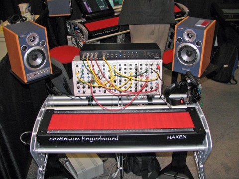 A half-size Haken Audio Continuum and its Control Voltage Converter (top) set up with a Serge Modular Blue Fun Station panel on top of a prototype of the Continuum Stand at the January 2007 NAMM show. (Mark Vail)