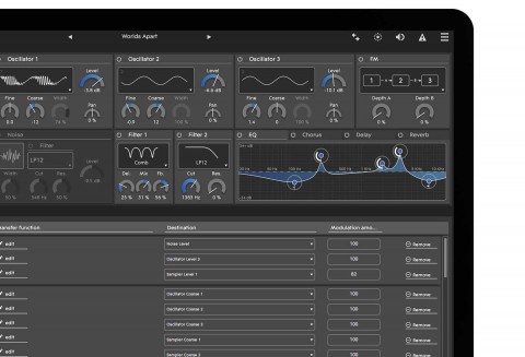 A close-up look at Equator parameters, including those for oscillators, filters, and a parametric equalizer. Access to parameters for controller assignments appear below. (Juan Trujillo, courtesy of Roli)