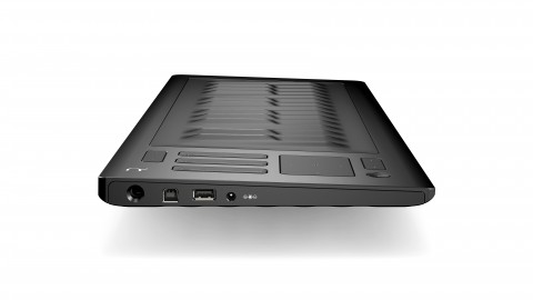 Located on the left end of the Roli Seqboard Rise (L to R) are an assignable foot-pedal input, USB A and B jacks, and the power input jack. Although you won’t find conventional MIDI connections, the Rise is capable of transmitting MIDI data wirelessly via Bluetooth technology. It can also run on batteries. (Juan Trujillo, courtesy of Roli)