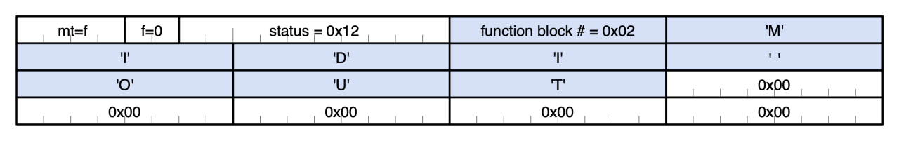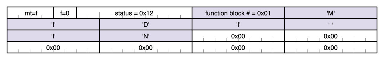 The Function Block Number (FB#) could have also been 0x00 to represent the first (and only) Function Block. This request is also asking to return both the Info and the Name of the Function Block. This request result in two replies: