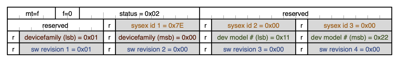 | Model Id | 0x11 0x22Family Id and Model Id are defined by the Manufacturer and often messages define that these are LSB first. Please review MIDI Specifications for a detailed explanation. |
