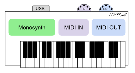 So far in the ACMESynth we have only declared a single Monosynth function. However many devices may require more than one function. Let’s take our device and add 2 more functions, a “MIDI IN” Din Port, and a “MIDI OUT” Din Port: