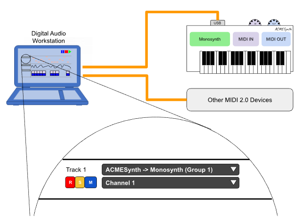 This is because a DAW is likely to adapt to the devices connected to it. In this case the ACMESynth declares it has the Monosynth on Group 1 and the DAW will send MIDI Messages on Group 1.