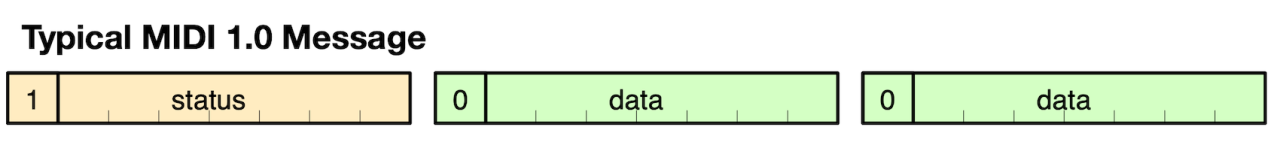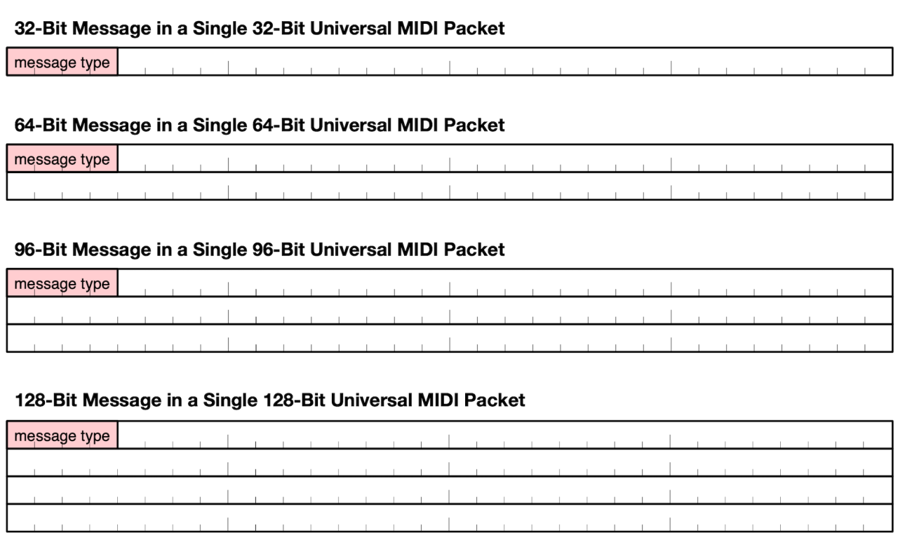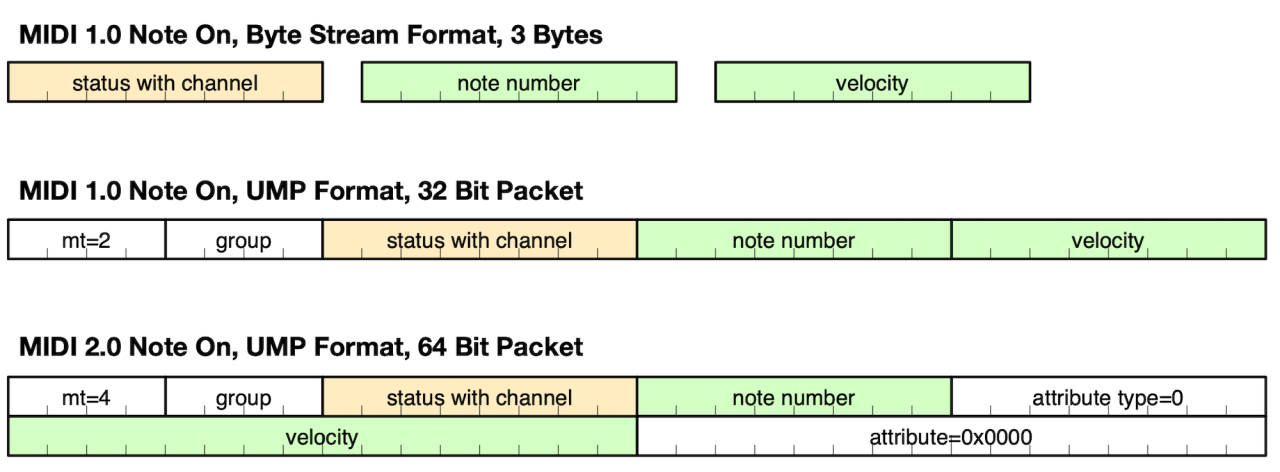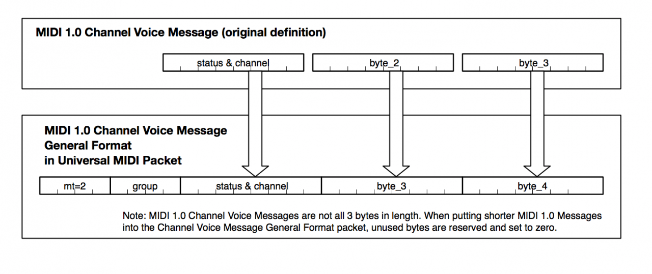 All existing MIDI 1.0 messages are carried in the Universal MIDI 1.0. As an example, this diagram from the protocol specification shows how MIDI 1.0 Channel Voice Messages are carried in 32-bit packets: