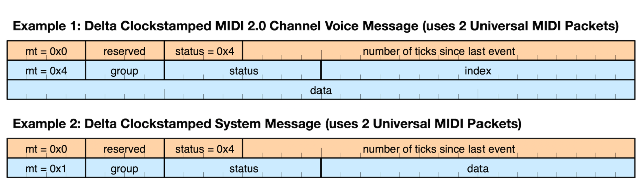 UMP format also provides optional “Jitter Reduction Timestamps”. These can be implemented for both MIDI 1.0 and MIDI 2.0 in UMP format.