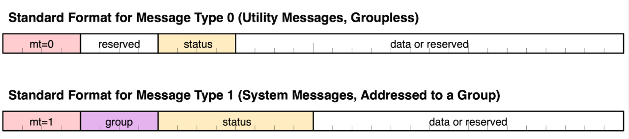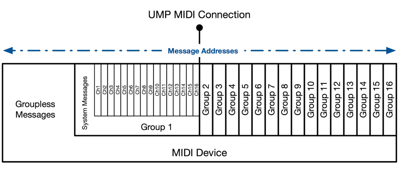 - Added the notion of Groupless messages. Some UMP Message Types are not sent to a specific Group. These messages are intended to be processed by the MIDI Endpoint.