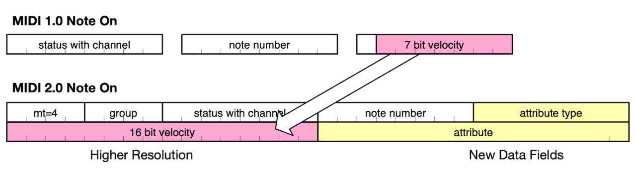 This example of a MIDI 2.0 Protocol Note message shows the expansions beyond the MIDI 1.0 Protocol equivalent. The MIDI 2.0 Protocol Note On has higher resolution Velocity. The 2 new fields, Attribute Type and Attribute data field, provide space for additional data such as articulation or tuning details