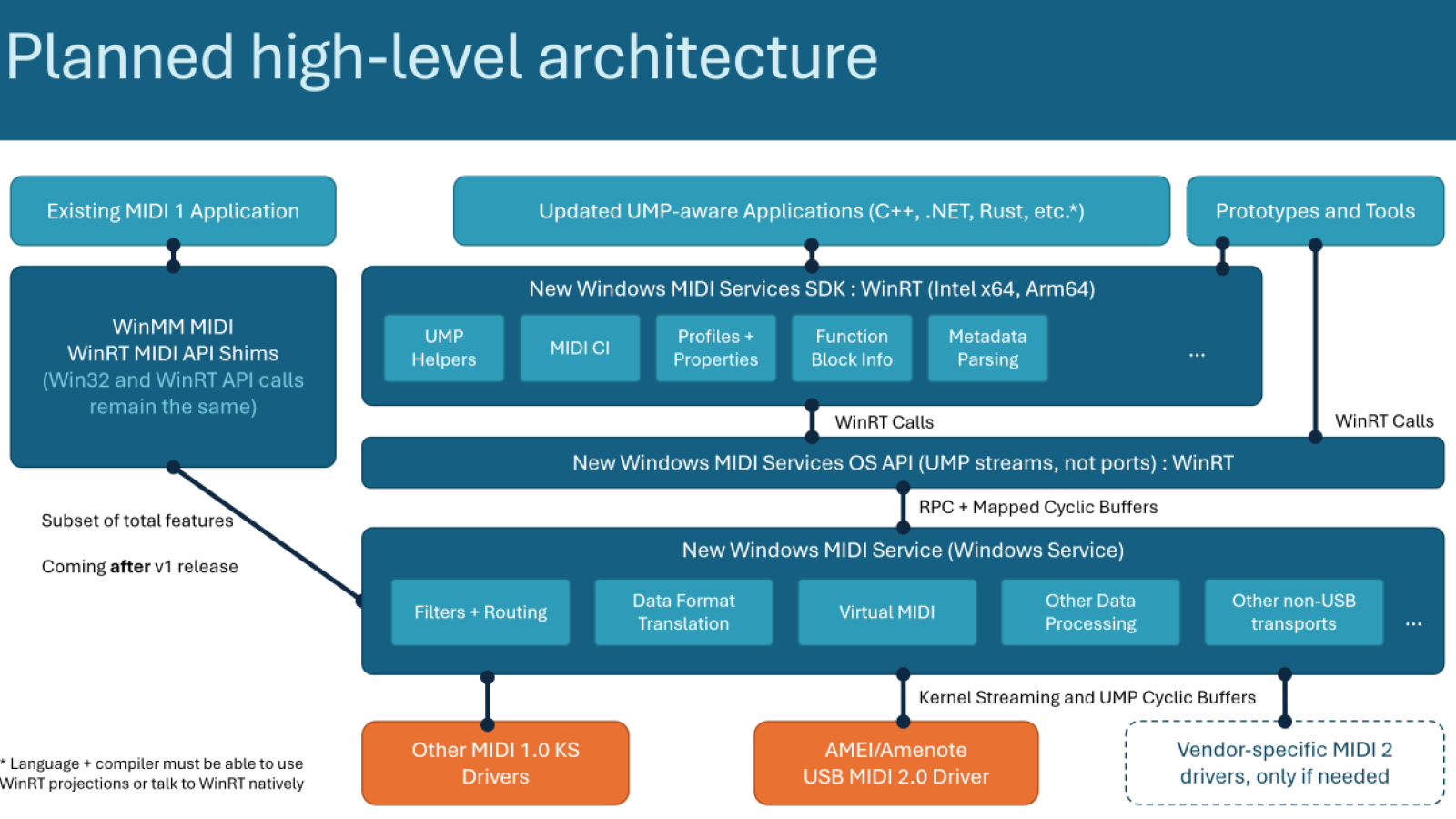 This Microsoft project is the next-generation MIDI API for Windows, including MIDI 1.0, MIDI CI, and MIDI 2.0. It includes enhancements, a new USB class driver, new transports, and a suite of essential tools. The project adds many enhancements and bug fixes to our MIDI 1.0 support, and importantly adds support for the latest revisions to MIDI CI and MIDI 2.0 as approved by The MIDI Association.