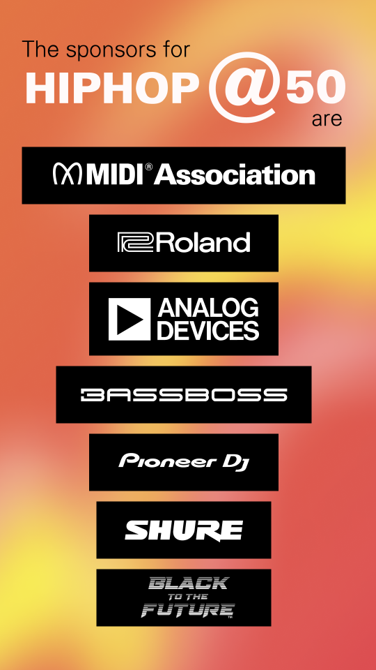 We raised money under the banner of HIP HOP@50 from Roland, Shure, Pioneer DJ, Analog Devices, BASSBOSS, The Midi Association, and Spectrasonic Virtual Instruments.