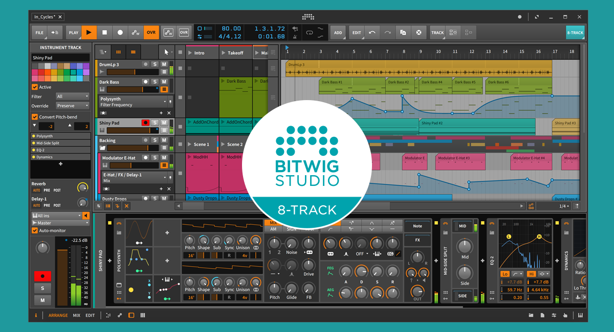 Bitwig Studio 8-Track, the trim and effective digital audio workstation to start producing, performing, and designing sounds like a pro. 8-Track includes a large selection of Bitwig devices for use on up to eight project tracks with audio or MIDI. Plug in your controller, record your instrument, produce simple arrangements, design new sounds, or just jam.