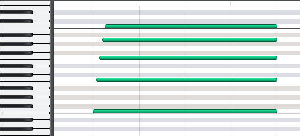 These notes were originally step-recorded with a step interval of 64th notes, but were quantized with 50% strength to tighten up the “strum.”