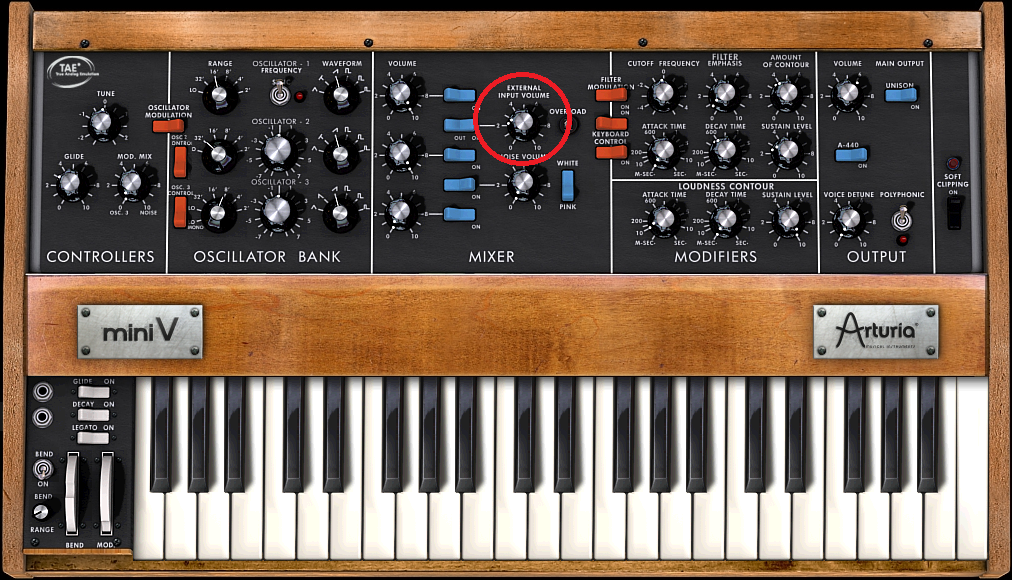 Arturia’s Mini V can also serve as a signal processor by feeding audio into the External Input. A volume control (highlighted in red) determines the level of the audio going through the synthesizer.