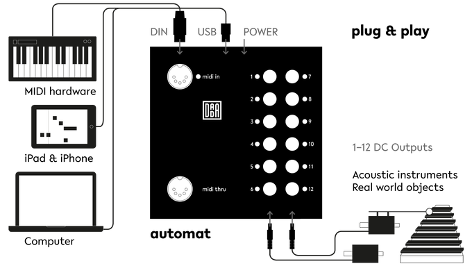 The center of each toolkit is the automat controller. Plug in your favorite software or hardware MIDI input directly into the controller. For output, automat controller has 12 universal DC outputs to connect motors, solenoids, LEDs – whatever you want to start playing. The automat is plug & play – offering unlimited possibilities. Simply connect your favorite MIDI hardware device, music App or DAW and trigger the actuators of your choice to create a composition.