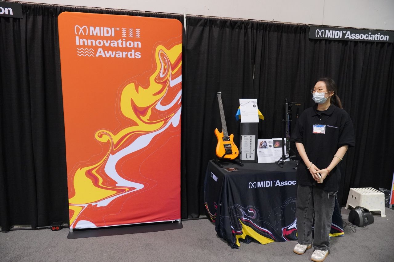 We had many of the entrants to the MIDI Innovation Awards displayed at the booth. You can see the Jammy MIDI Guitar with some Ukranian flags around it. Jammy is based in Kviv and all of their staff are now either refugees or in the Ukranian army.