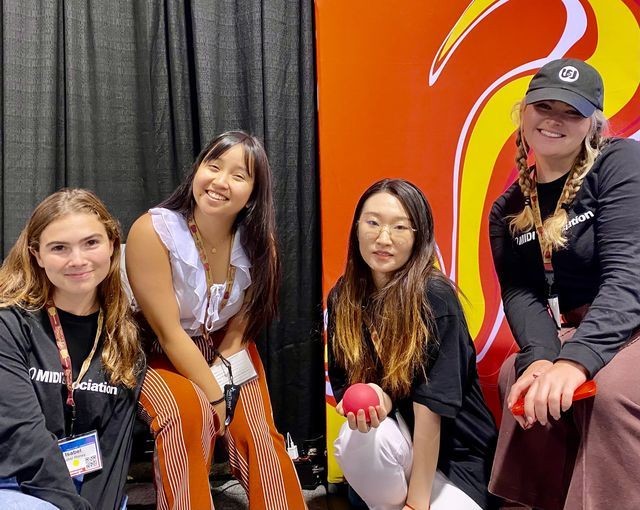 Dan Leonard from Chapman University arranged for some of his music technology students to be at our booth helping guide people and scanning badges. Anita Xu, Clarisse Guevarra, Isabel Roney, and Hailey Leonard did an amazing job and really enjoyed the opportunity to participate in the NAMM show. They helped demo the MIDI Innovation Award entrants that were educationally focused like the Digitiaze MIDI Violin, the Oddball, the Artiphon Orba and Big Ear Games.