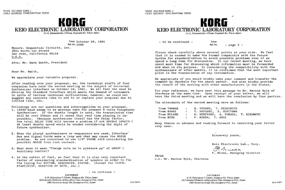 Mieda-san from Korg responds on behalf of the Japanese companies to the meetings at the 1981 Gakki Fair with Sequential and Oberheim and confirms the discussion that they had at the Gakki Fair.