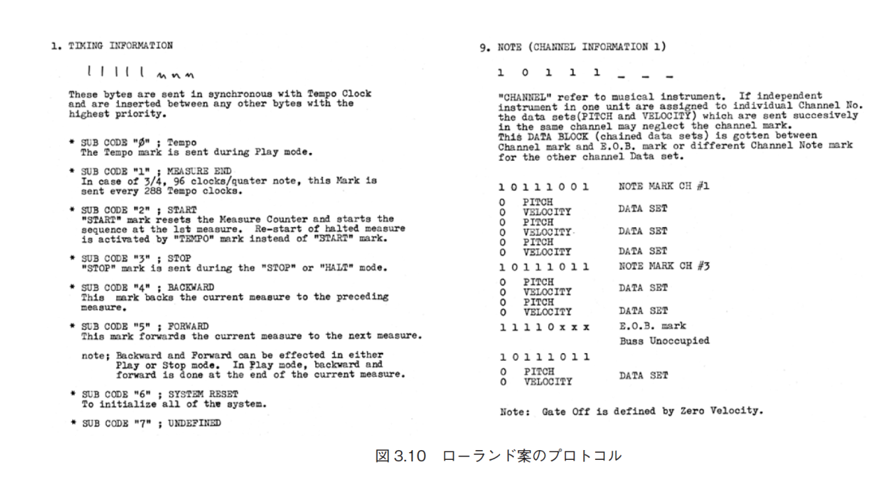 Following the USI discussion at Anaheim, an alternative specification was presented by some of the Japanese companies which had grown out of their own research. Whereas the USI was basically content to specify note on/off codes, this new proposal went on to define many more complex operations. It also offered a different data structure, with status and data bytes being flagged by bit 7 O=status, O=data). This greatly simplified the protocol by eliminating all the checks which were otherwise needed to distinguish the data category. With the most significant bit now defined as a “flag,” data is thereby limited to 7 bits, but this is sufficient for most synth data, and when not, can simply be sent as multiple 4–bit nibbles.