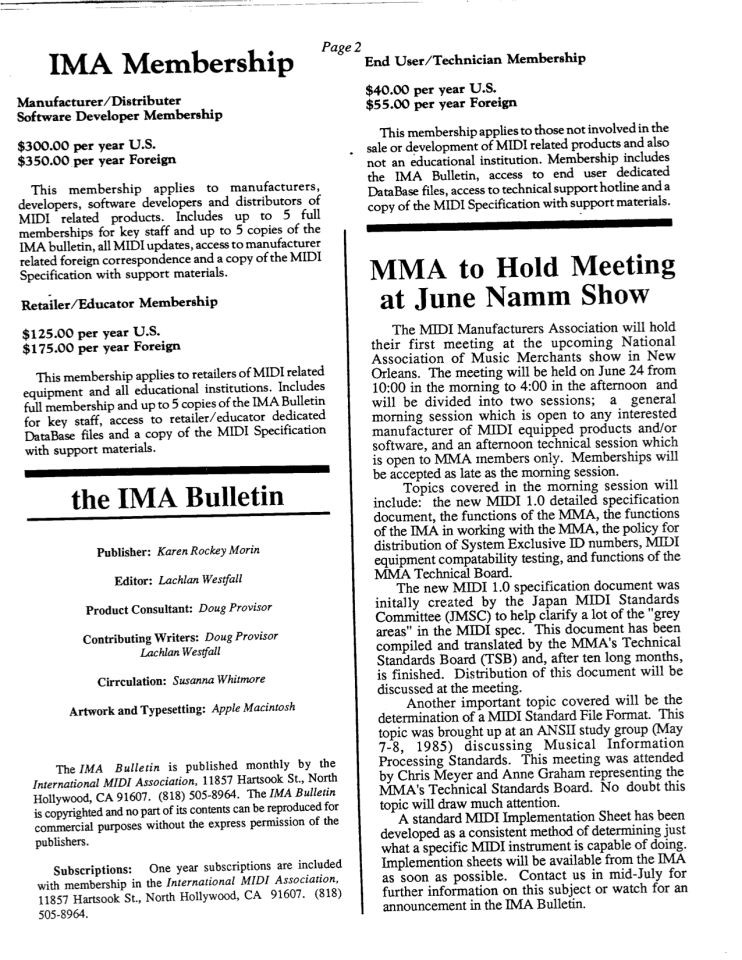 This arrangement between the MMA and IMA was probably made easier by the fact that Roger Clay who had been somewhat antagonistic to the manufacturers (as seen in his comments in the Turmoil in MIDI Land article) was no longer with the IMA.