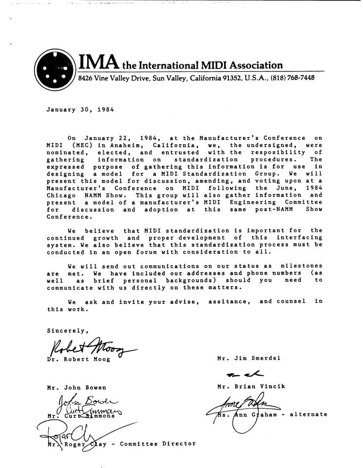International MIDI Association incorporated and initial MIDI 1.0 specification described in this article is available from IMA (via Sequential Circuits). The International MIDI Association (“IMA”) (a.k.a. “MUG or MIDI Users Group” and “IMUG” International MIDI User Group), was formed right after the JMSC. It was a self-appointed organization to manage the development and promotion of MIDI.