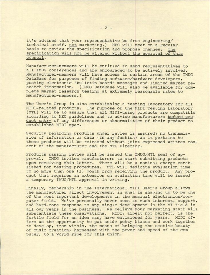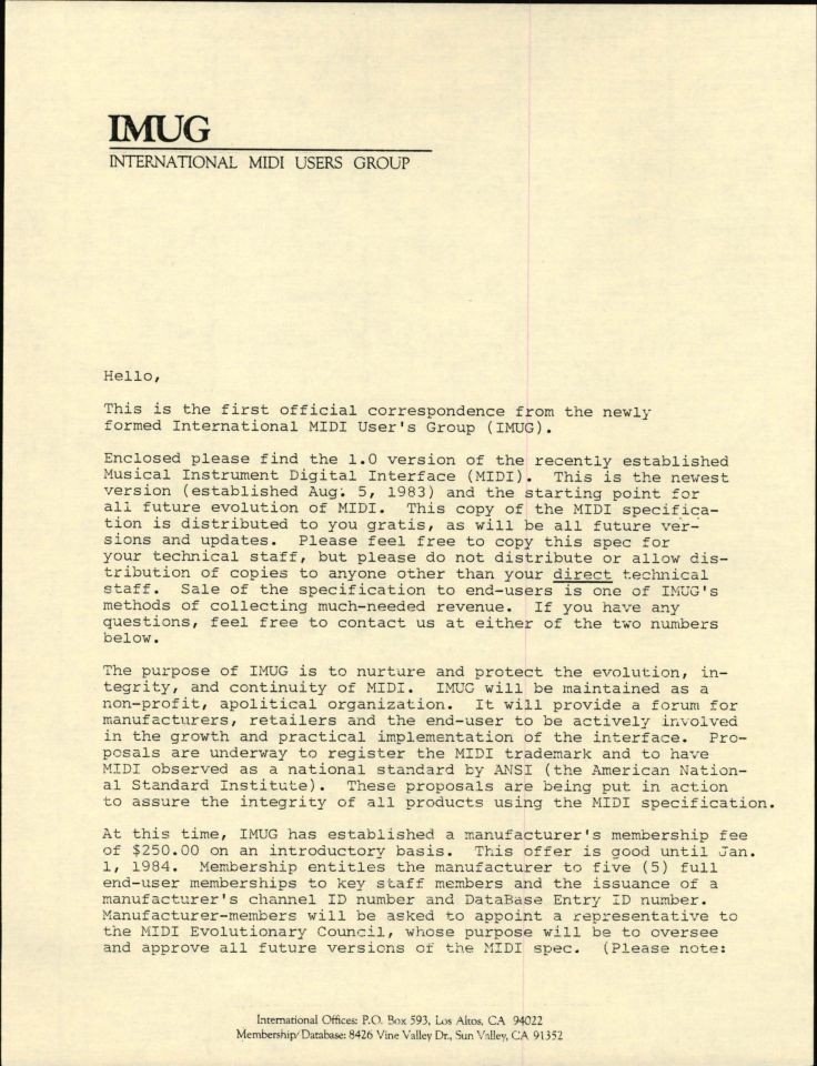 Here is a copy of the initial goals of the MUG which were pretty expansive and included responding to all letters (yes, letters- remember this was all before not just the Internet, but the fax machine!) about MIDI, providing the MIDI specifications to anyone who wanted it , assign SysEx IDs and maintain a database with ALL user names and concerns.