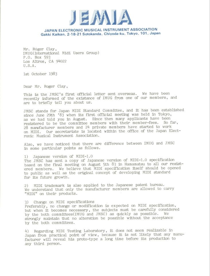 On February of 1983 just a month after the 1983 NAMM show, the Japanese formed the MIDI Standard Liaison Committee and later the same year changed the name to the Japan MIDI Standards Committee (JMSC).