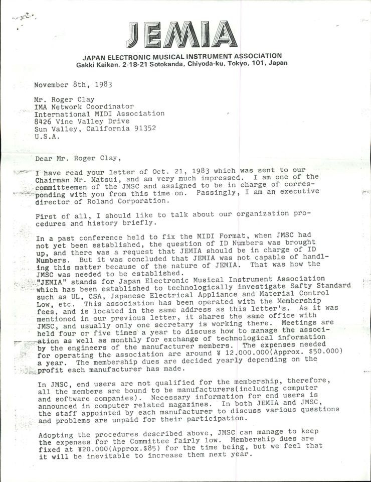 The Japanese Electronic Music Industry Association (JEMIA, now AMEI, the Association of Musical Electronics Industries) had been formed in 1976 and was a professional association that included manufacturers like Yamaha, Roland, Kawai and Korg.