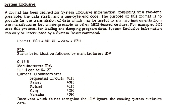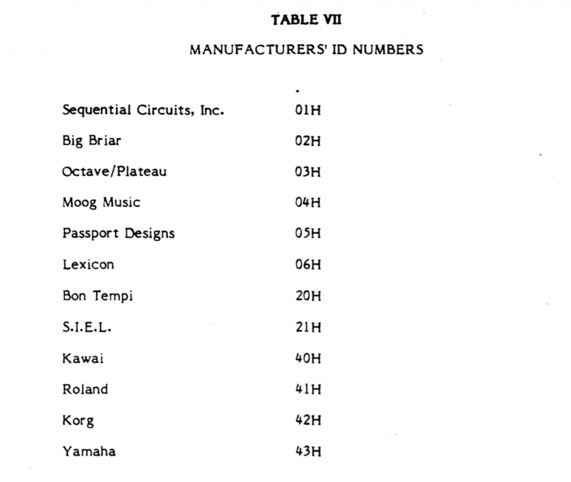 We also documented that in 1983, there were only 5 companies working on MIDI- Sequential Circuits, Kawai, Korg, Roland and Yamaha. That is pretty easy to confirm because here are the SysEx IDs in the Prophet 600 manual from December of 1982.