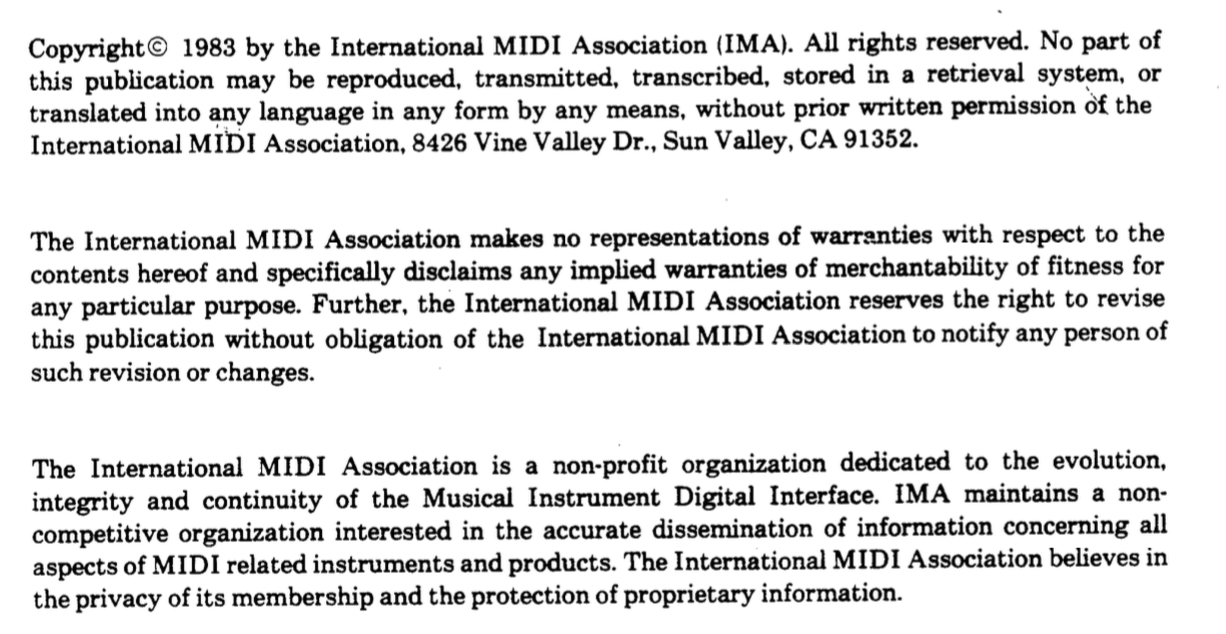 The original MIDI 1.0 Specification was written by companies collaborating outside of any organization, and though different entities with different acronyms (the Japanese MIDI Standard Committee or JMSC, The MIDI Manufacturers Association or MMA, and the International MIDI Association or IMA) all formed to help manage the development of MIDI, they all formed independently, and it took a few years before they all figured out how to move forward in “unison”. (Sorry for being in pun mode)