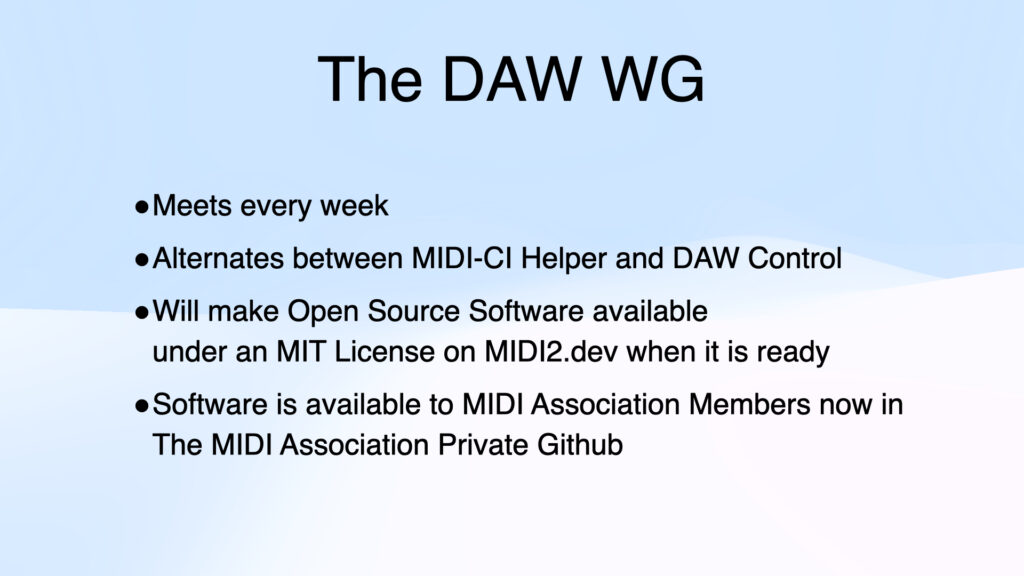 Before Super Booth in May of 2024, The MIDI Association hosted the first meeting of the DAW working group at the Native Instruments office in Berlin, where the companies agreed to work together to develop open-source software available under a permissive MIT license to bridge the gap between external MIDI Devices, Digital Audio Workstations (DAWs), and plugins. That cooperative project is ongoing in the MIDI Association’s DAW Working Group.