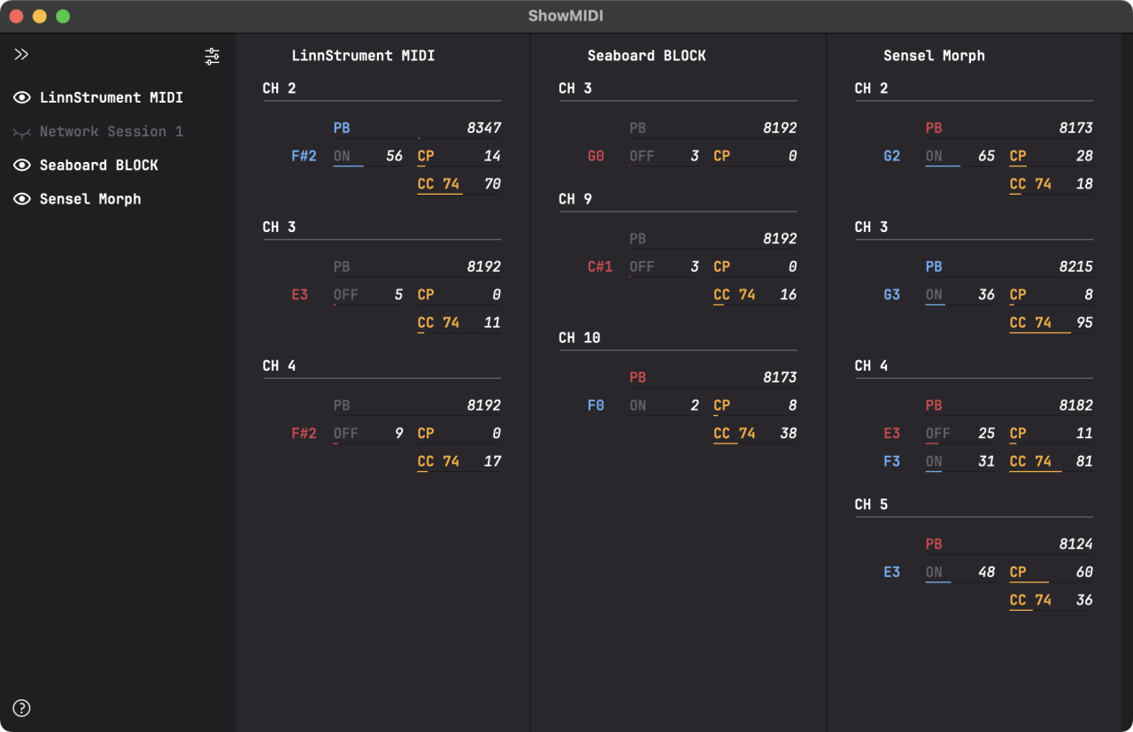 Below is an introduction video that shows how the standalone version of ShowMIDI works. You get a glimpse of what the impetus for creating this tool was and how you can use it with multiple MIDI devices. Seeing the comparison between traditional MIDI monitor logs (including my ReceiveMIDI tool) and ShowMIDI’s visualization, clearly illustrates how the information becomes much easier to understand and consume.