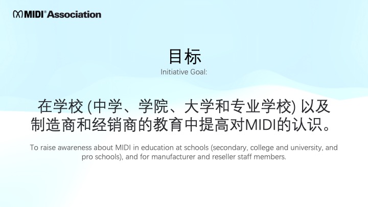 Our goal is to raise awareness about MIDI in education at schools (secondary, college and university, and pro schools), MIDI Musical Instrument manufacturers and Dealers who sell MIDI products.