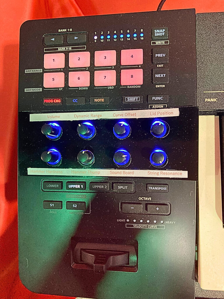 A88 MKII with Registered Controllers for Volume, Dynamic Range, Curve Offset, Lid Position, Hammer Hardness, Thump Noise, Sound Board Resonance, and String Resonance.