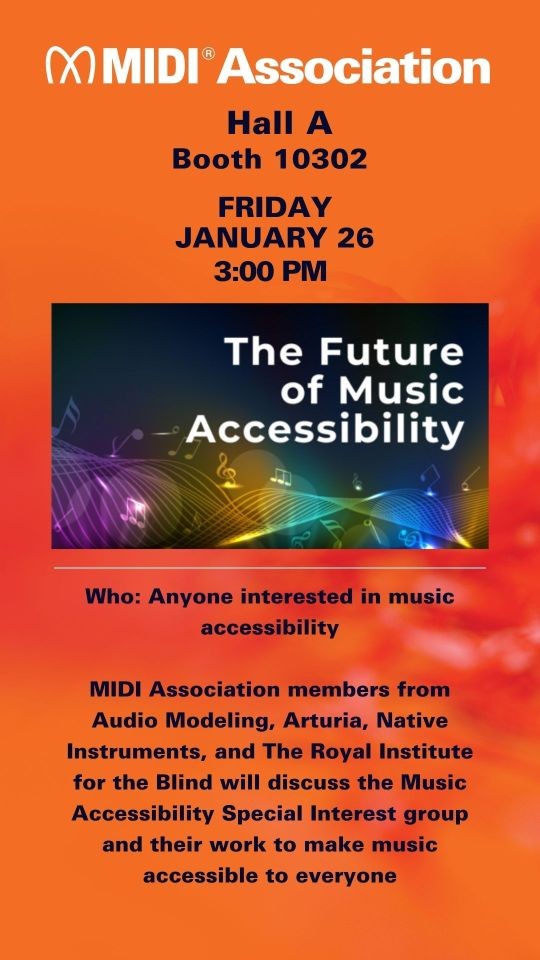 MIDI Association members from Audio Modeling, Arturia, Native Instruments, and The Royal Institute for the Blind will discuss the Music Accessibility Special Interest group and their work to make music accessible to everyone