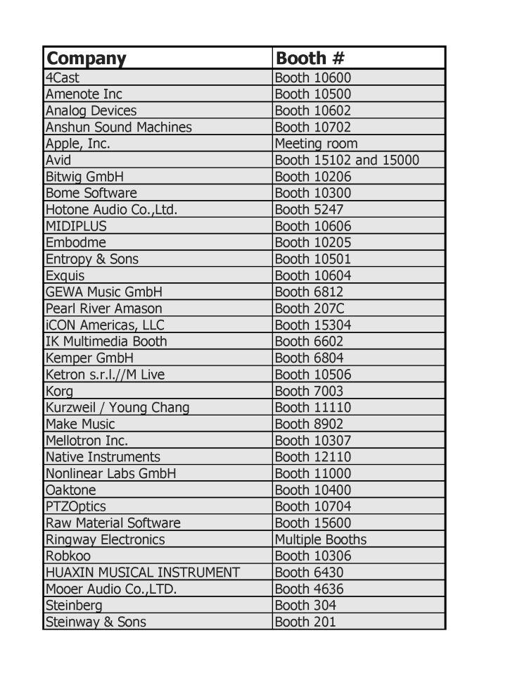 The MIDI Association Thursday Booth Schedule