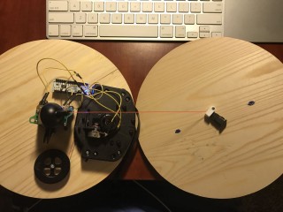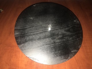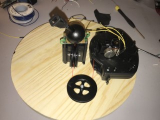 I used the flywheel from the unused joystick to reroute the string from the potentiometer. This was necessary because I wanted the joystick as close to the center of the piece of wood as possible. However, the size and shape of the wood and the parts left me few options for assembly. It was important to route the string from the bottom of the joystick becue the IC board on the joystick prevented any other way of routing the string.