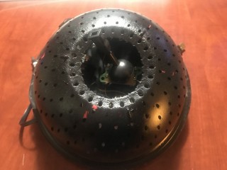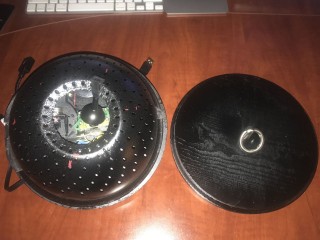 The next step was to reassemble the pieces into a new form. I looked for an old concertina thinking I could insert the Gametrak pieces but this search was unsuccessful. After several attempts to create my own bellow for the Tirare, I realized copying the physical form of a concertina would not work because there would be no way to keep the bellow from resting on the string. I decided to find a new physical form to house the Gametrak pieces. Ultimately, I chose to use two small round pieces of wood (craft store), basic drawer handles (Home Depot), and a small strainer (dollar store). I initially intended this design to be a working prototype and not the final product. However, I have yet to find a better way to embody the joystick.