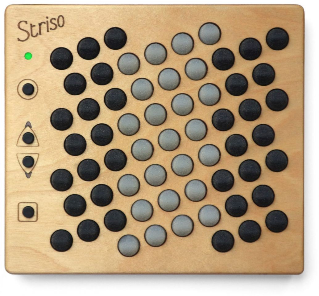 The Striso board is an expressive instrument which combines multidimensionally sensitive buttons with an innovative note layout that helps understand the structures in music. The buttons capture each subtle finger movement, which allows for levels of musical expression previously only known to acoustic instruments. Additionally, accents and sound effects can be added by shaking and moving the instrument as a whole.
